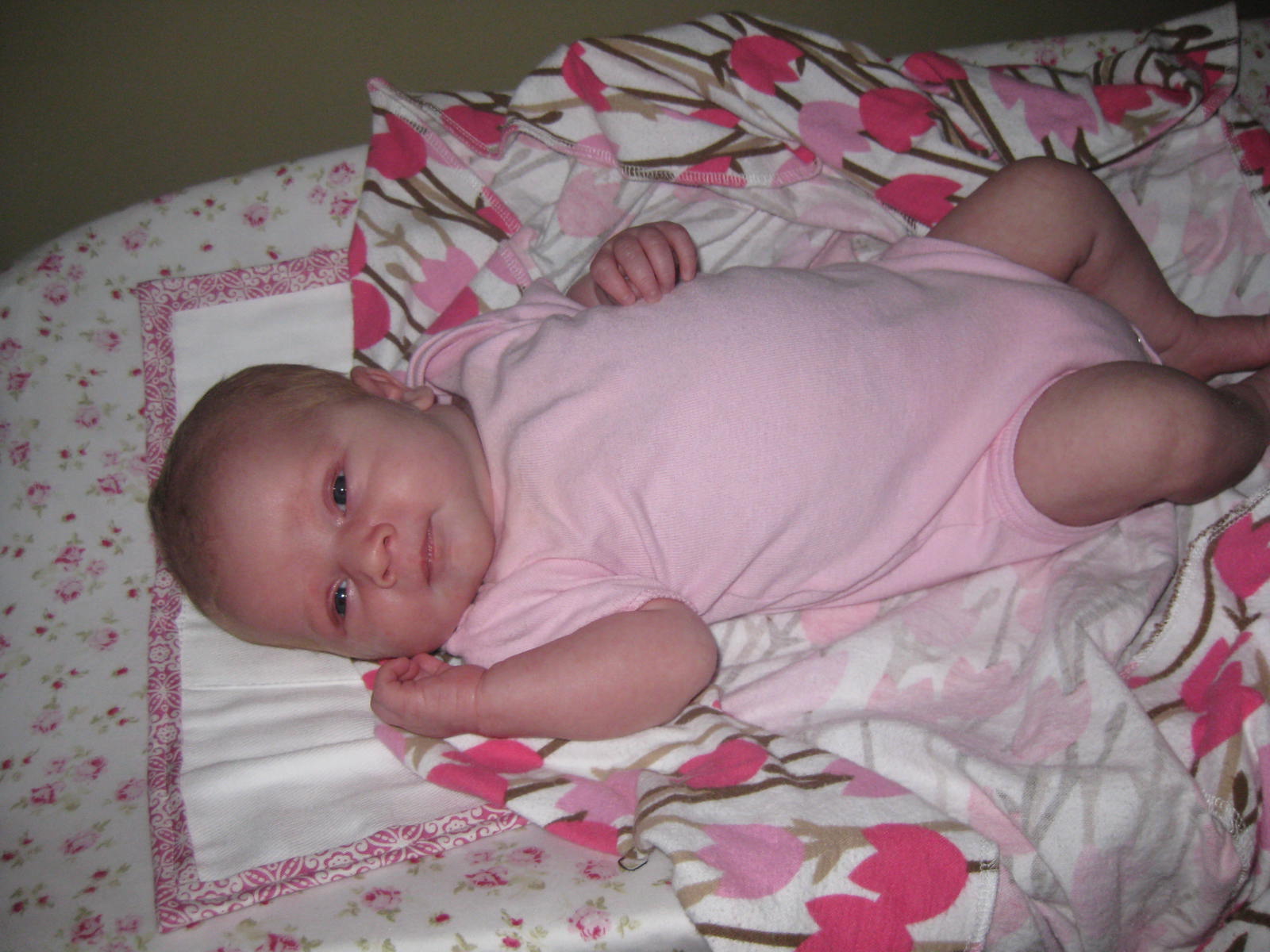 She's eating every 3 hours about 3-4 ounces. She's pretty well behaved. I had a hard time breaking her wanting to be held habit, but thankfully that is over. I would hold her all day if I could but it's pretty impossible with two other children who are needy in different ways. She still naps throughout the day, when she is awake she stares into space and gives us some awesome smiles that melts my heart. She definitely has blue eyes but they can always change to be brown like her mommy. Her hair is changing big time. The sides that are growing are a bright orangey red. The rest of her hair is weird. The back top and very bottom is brown which will mostly likely fall out (the doctor said) and the middle back around the side is blonde. I'm thinking at this point anything can happen. She's seems to have all 3 on her head right now. I hoping she'll be light brown like her mommy but would be happy to have a red head like her daddy! I already have 2 blondes don't need another one! ;)